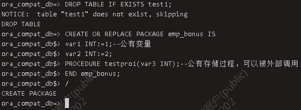 创建包头 DROP TABLE IF EXISTS test1;CREATE OR REPLACE PACKAGE emp_bonus ISvar1 INT:=1;--公有变量var2 INT:=2;PROCEDURE testpro1(var3 INT);--公有存储过程,可以被外部调用END emp_bonus;/