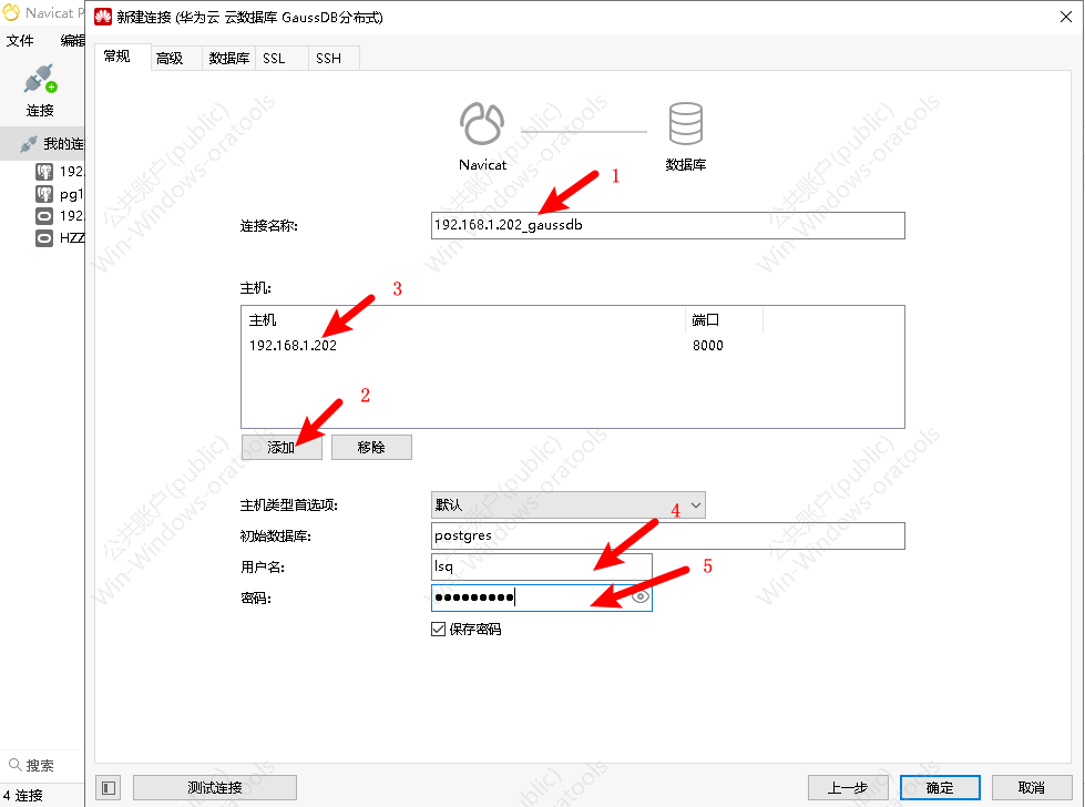 下一窗口中,按顺序 1、给连接起个名 2、添加主机 3、更改主机ip及端口信息 4、输入数据库用户名 5、输入数据库用户密码