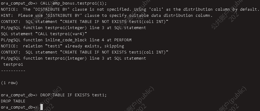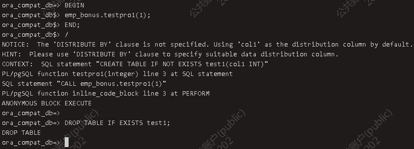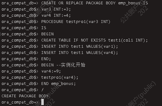 创建包体 CREATE OR REPLACE PACKAGE BODY emp_bonus ISvar3 INT:=3;var4 INT:=4;PROCEDURE testpro1(var3 INT)ISBEGINCREATE TABLE IF NOT EXISTS test1(col1 INT);INSERT INTO test1 VALUES(var1);INSERT INTO test1 VALUES(var4);END;BEGIN --实例化开始var4:=9;testpro1(var4);END emp_bonus;/