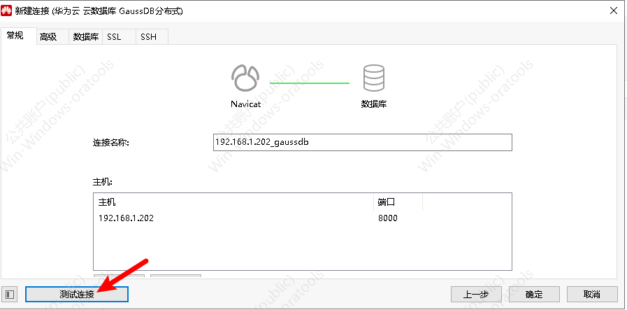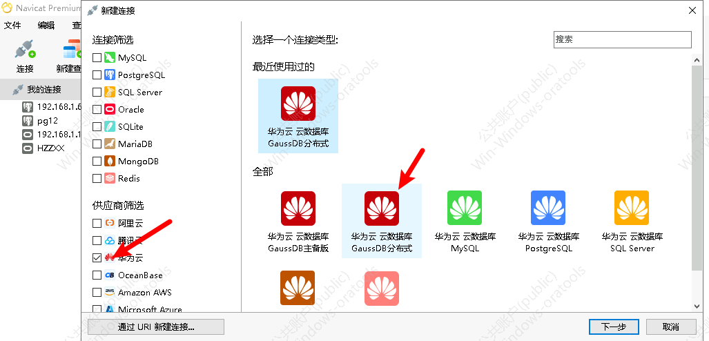 新建连接窗口中,左侧供应商筛选选择“华为云”,然后右侧窗口选择“华为云 云数据库GaussDb分布式”,下一步