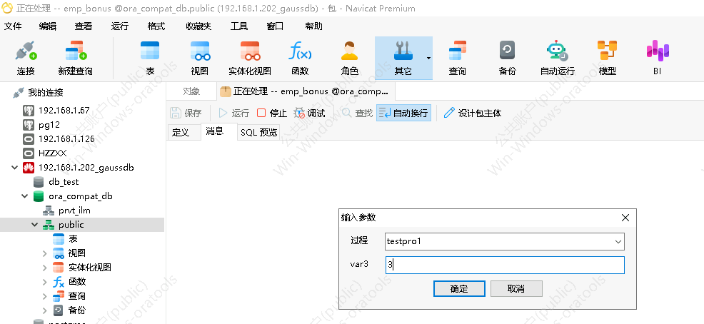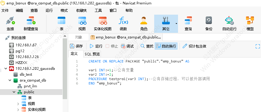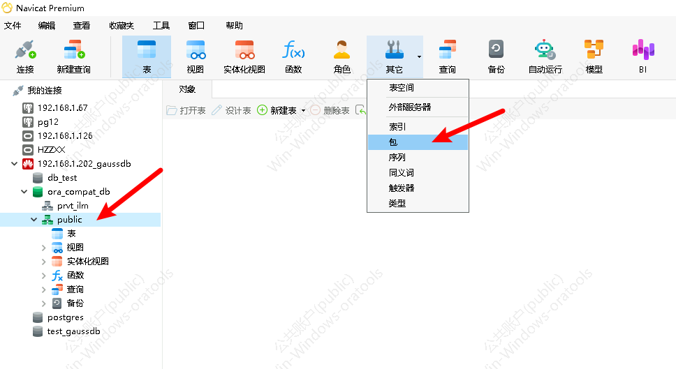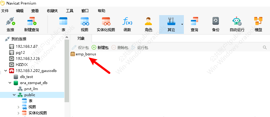 选择package 双击ora_coompat_db数据库,然后双击public。 点击快捷图标“其他”,选择“包”