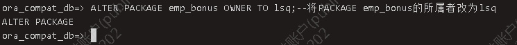 ALTER PACKAGE OWNER ALTER PACKAGE emp_bonus OWNER TO lsq;--将PACKAGE emp_bonus的所属者改为lsq