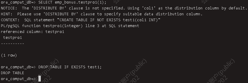 调用PACKAGE --使用call调用package存储过程CALL emp_bonus.testpro1(1); DROP TABLE IF EXISTS test1;--使用select调用package存储过程SELECT emp_bonus.testpro1(1); DROP TABLE IF EXISTS test1;--匿名块里调用package存储过程BEGINemp_bonus.testpro1(1);END;/DROP TABLE IF EXISTS test1;--删除PACKAGE。DROP PACKAGE emp_bonus;--删除数据库。DROP DATABASE ora_compat_db;