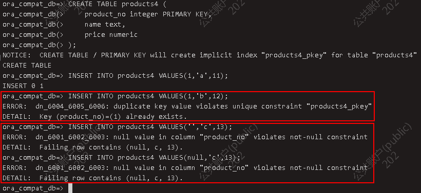 1.2.2 非空约束 非空约束的字段,如果在添加数据时没有指定值,就会报错。可以为表中多个字段添加非空约束。 CREATE TABLE products2 ( product_no integer NOT NULL, name text NOT NULL, price numeric NOT NULL CHECK (price > 0));INSERT INTO products2 VALUES(1,'a',11);违反约束:INSERT INTO products2 VALUES(1,'',11);INSERT INTO products2 VALUES(1,null,11);