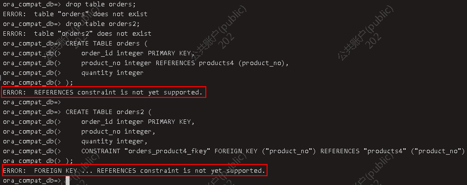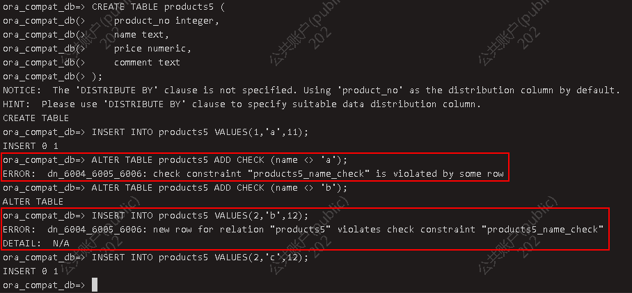 1.2.5.2 分布式 目前版本分布式数据库不支持外键约束! CREATE TABLE orders ( order_id integer PRIMARY KEY, product_no integer REFERENCES products4 (product_no), quantity integer);CREATE TABLE orders2 ( order_id integer PRIMARY KEY, product_no integer, quantity integer, CONSTRAINT "orders_product4_fkey" FOREIGN KEY ("product_no") REFERENCES "products4" ("product_no") );