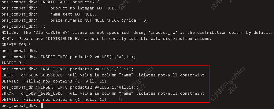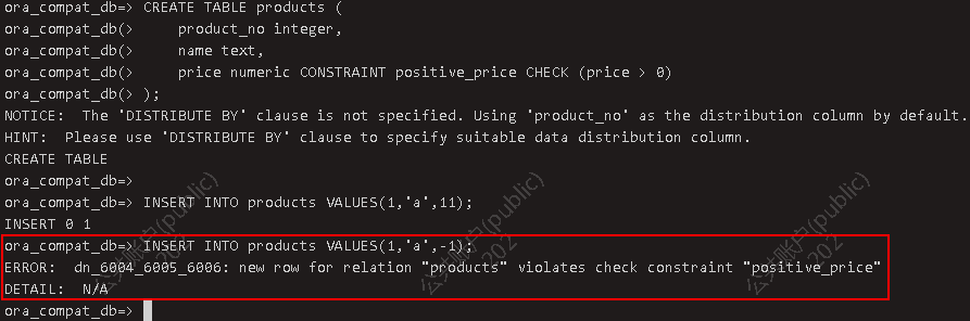 【经验分享】关于GaussDB约束,你了解多少?发表时间:2023-06-05 10:33 gsql连接数据库 gsql -d db_tpcc -U joe -W Bigdata@123 -p 15400 1.创建表及约束 1.1 建表语法 1.1.1主备式 CREATE [ [ GLOBAL | LOCAL ] { TEMPORARY | TEMP } | UNLOGGED ] TABLE [ IF NOT EXISTS ] table_name{({ column_name data_type [ CHARACTER SET | CHARSET charset ] [ compress_mode ] [ COLLATEcollation ] [ column_constraint [ ... ] ]| table_constraint| LIKE source_table [ like_option [...] ] }[, ... ])| LIKE source_table }[ table_option [ [ , ] ... ] ][ WITH ( {storage_parameter = value} [, ... ] ) ][ ON COMMIT { PRESERVE ROWS | DELETE ROWS } ] [ COMPRESS | NOCOMPRESS ][ ILM ADD POLICY ROW STORE { COMPRESS ADVANCED } { ROW } AFTER n { day | month | year } OF{ NO MODIFICATION } [ ON ( EXPR )]][ TABLESPACE tablespace_name ]; ● 其中列约束column_constraint为: [ CONSTRAINT constraint_name ]{ NOT NULL |NULL |CHECK ( expression ) |DEFAULT default_expr |ON UPDATE update_expr |GENERATED ALWAYS AS ( generation_expr ) [STORED] |GENERATED [ ALWAYS | BY DEFAULT [ ON NULL ] ] AS IDENTITY [ ( identity_options ) ] |AUTO_INCREMENT |COMMENT 'string' |UNIQUE [KEY] index_parameters |PRIMARY KEY index_parameters |ENCRYPTED WITH ( COLUMN_ENCRYPTION_KEY = column_encryption_key, ENCRYPTION_TYPE =encryption_type_value ) |REFERENCES reftable [ ( refcolumn ) ] [ MATCH FULL | MATCH PARTIAL | MATCH SIMPLE ][ ON DELETE action ] [ ON UPDATE action ] }[ DEFERRABLE | NOT DEFERRABLE | INITIALLY DEFERRED | INITIALLY IMMEDIATE ] ● 其中表约束table_constraint为: [ CONSTRAINT [ constraint_name ] ]{ CHECK ( expression ) |UNIQUE [ index_name ] [ USING method ] ( { { column_name [ ( length ) ] | ( expression ) } [ ASC |DESC ] } [, ... ] ) index_parameters |PRIMARY KEY [ USING method ] ( { column_name [ ASC | DESC ] } [, ... ] ) index_parameters|FOREIGN KEY [ index_name ] ( column_name [, ... ] ) REFERENCES reftable [ ( refcolumn [, ... ] ) ][ MATCH FULL | MATCH PARTIAL | MATCH SIMPLE ] [ ON DELETE action ] [ ON UPDATEaction ] }[ DEFERRABLE | NOT DEFERRABLE | INITIALLY DEFERRED | INITIALLY IMMEDIATE ]{ [ COMMENT 'string' ] [ ... ] } ● CONSTRAINT constraint_name 列约束或表约束的名称。可选的约束子句用于声明约束,新行或者更新的行必须满足这些约束才能成功插入或更新。定义约束有两种方法:– 列约束:作为一个列定义的一部分,仅影响该列。– 表约束:不和某个列绑在一起,可以作用于多个列。 ● NOT NULL 字段值不允许为NULL。 ● CHECK ( expression ) CHECK约束声明一个布尔表达式,每次插入或者更新的行必须使表达式结果为真或未知才能成功,否则会抛出一个异常并且不会修改数据库。 ● DEFAULT default_expr DEFAULT子句给字段指定缺省值。该数值可以是任何不含变量的表达式(不允许使用子查询和对本表中的其他字段的交叉引用)。缺省表达式的数据类型必须和字段类型匹配。缺省表达式将被用于任何未声明该字段数值的插入操作。如果没有指定缺省值则缺省值为NULL 。 ● UNIQUE [KEY] index_parameters UNIQUE约束表示表里的一个或多个字段的组合必须在全表范围内唯一。UNIQUE KEY只能在B模式数据库下(即sql_compatibility = 'B')支持使用,与UNIQUE语义相同。 ● UNIQUE index_name ( {{ column_name [ ( length ) ]| ( expression ) } [ ASC | DESC ] }[, ... ] ) index_parameters UNIQUE约束表示表里的一个字段或多个字段的组合必须在全表范围内唯一。对于唯一约束, NULL被认为是互不相等的。column_name(length)是前缀键,详见: •column_name ( length )。index_name为索引名。 ● PRIMARY KEY index_parametersPRIMARY KEY [ USING method ] ( { column_name [ ASC | DESC ] }[, ... ] ) index_parameters 主键约束声明表中的一个或者多个字段只能包含唯一的非NULL值。一个表只能声明一个主键。 ● REFERENCES reftable [ ( refcolumn ) ] [ MATCH matchtype ] [ ONDELETE action ] [ ON UPDATE action ] (column constraint)FOREIGN KEY ( column_name [, ... ] ) REFERENCES reftable [ ( refcolumn[, ... ] ) ] [ MATCH matchtype ] [ ON DELETE action ] [ ON UPDATEaction ] (table constraint) 外键约束要求新表中一列或多列构成的组应该只包含、匹配被参考表中被参考字段值。若省略refcolumn,则将使用reftable的主键。被参考列应该是被参考表中的唯一字段或主键。外键约束不能被定义在临时表和永久表之间。参考字段与被参考字段之间存在三种类型匹配,分别是:– MATCH FULL:不允许一个多字段外键的字段为NULL,除非全部外键字段都是NULL。– MATCH SIMPLE(缺省):允许任意外键字段为NULL。– MATCH PARTIAL:目前暂不支持。另外,当被参考表中的数据发生改变时,某些操作也会在新表对应字段的数据上执行。 ON DELETE子句声明当被参考表中的被参考行被删除时要执行的操作。ON UPDATE子句声明当被参考表中的被参考字段数据更新时要执行的操作。对于ON DELETE子句、 ON UPDATE子句的可能动作:– NO ACTION(缺省):删除或更新时,创建一个表明违反外键约束的错误。 若约束可推迟,且若仍存在任何引用行,那这个错误将会在检查约束的时候产生。– RESTRICT:删除或更新时,创建一个表明违反外键约束的错误。与NO ACTION相同,只是动作不可推迟。– CASCADE:删除新表中任何引用了被删除行的行,或更新新表中引用行的字段值为被参考字段的新值。– SET NULL:设置引用字段为NULL。– SET DEFAULT:设置引用字段为它们的缺省值。 ● DEFERRABLE | NOT DEFERRABLE 这两个关键字设置该约束是否可推迟。一个不可推迟的约束将在每条命令之后马上检查。可推迟约束可以推迟到事务结尾使用SET CONSTRAINTS命令检查。缺省是NOT DEFERRABLE。目前, UNIQUE约束、主键约束、外键约束可以接受这个子句