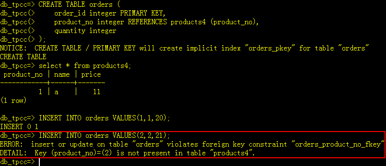 1.2.5 外键约束 当两个表包含一个或多个公共列时,可以通过外键约束来强制两个表之间的关系。– FOREIGN KEY:用来指定该表中和被引用的表有关系的字段。– REFERENCES:用来指定被引用的表和原表有关系的字段。 外键约束的特点: 定义为外键约束的字段中只能包含相应的其他表中引用字段的值或NULL。 可以为一个字段或者多个字段定义外键约束。 定义了外键约束的字段和相应的引用字段可以存在同一个表中,称为自引用。 对同一个字段可以同时定义外键和非空约束。主表中被应用的列,必须有主键约束或唯一约束。 1.2.5.1 主备式 CREATE TABLE orders ( order_id integer PRIMARY KEY, product_no integer REFERENCES products4 (product_no), quantity integer);select * from products4;INSERT INTO orders VALUES(1,1,20);违反约束:INSERT INTO orders VALUES(2,2,21);