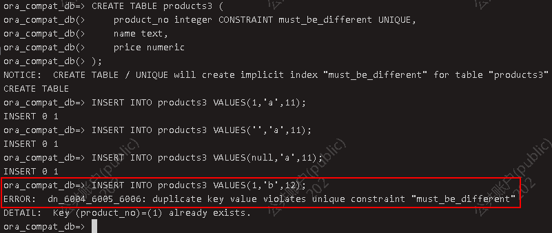 1.2.3 唯一约束 关键字UNIQUE给字段添加一个唯一约束,插入数据时该字段如有重复则触发约束,多个NULL不算重复,添加唯一约束时,会自动增加一个唯一索引。可以为表中多个字段添加唯一约束。 CREATE TABLE products3 ( product_no integer CONSTRAINT must_be_different UNIQUE, name text, price numeric);INSERT INTO products3 VALUES(1,'a',11);INSERT INTO products3 VALUES('','a',11);INSERT INTO products3 VALUES(null,'a',11);违反约束:INSERT INTO products3 VALUES(1,'b',12);