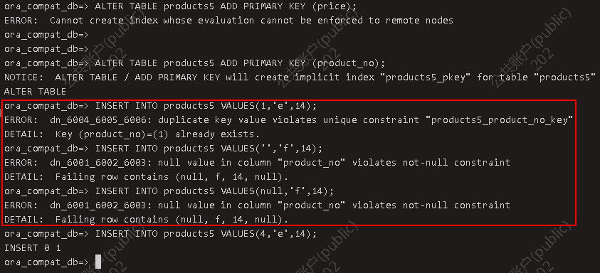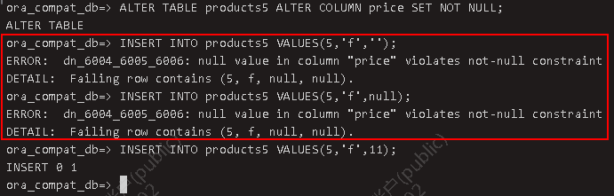 要增加一个不能写成表约束的非空约束,可使用语法: ALTER TABLE products5 ALTER COLUMN price SET NOT NULL;INSERT INTO products5 VALUES(5,'f','');INSERT INTO products5 VALUES(5,'f',null);INSERT INTO products5 VALUES(5,'f',11); 该约束会立即被检查,所以表中的数据必须在约束被增加之前就已经符合约束。