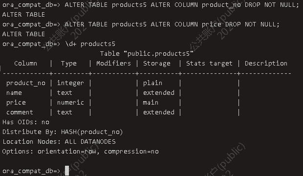 和移除一个列相似,如果需要移除一个被某些别的东西依赖的约束,也需要加上CASCADE。一个例子是一个外键约束依赖于被引用列上的一个唯一或者主键约束。 这对除了非空约束之外的所有约束类型都一样有效。为了移除一个非空约束可以用: ALTER TABLE products5 ALTER COLUMN product_no DROP NOT NULL;ALTER TABLE products5 ALTER COLUMN price DROP NOT NULL;\d+ products5 (回忆一下,非空约束是没有名称的,所以不能用第一种方式。)
