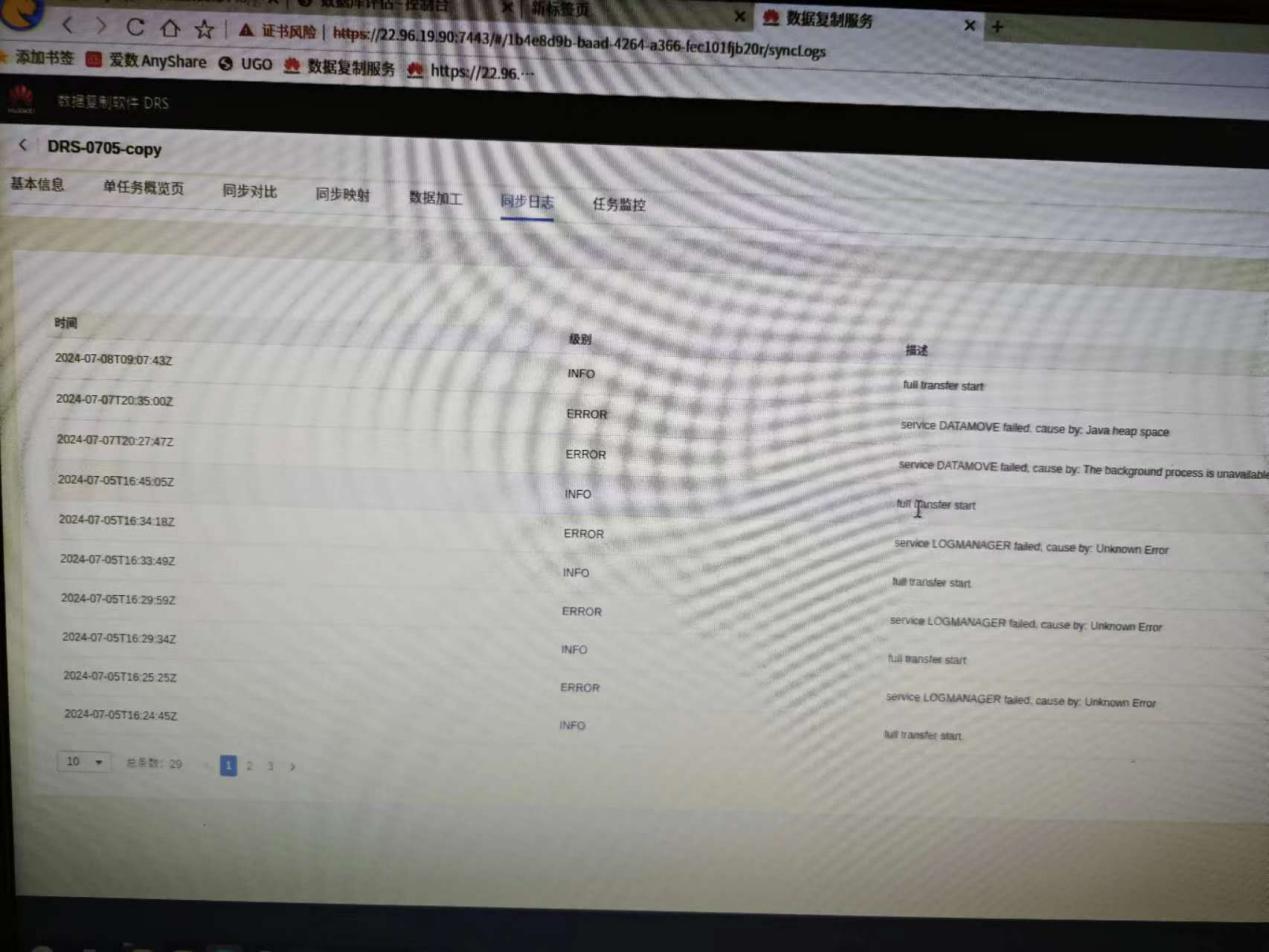 Jvm空间不足导致异常退出。多次重启任务仍然如此,报错可能会在unknow error 设置drs参数,jvm使用20g sync.tunstenEnv.OPS_FULL_INCRE_MAX=20480 设置drs参数,数据源超时时间 *.datamove.source.urlOptions=&oracle.jdbc.ReadTimeout=300000 卡在某个分片,长时间没有进展 首先尝试暂停-续传任务 如果仍没有效果,使用以下sql在drs的库中查看进程的状态