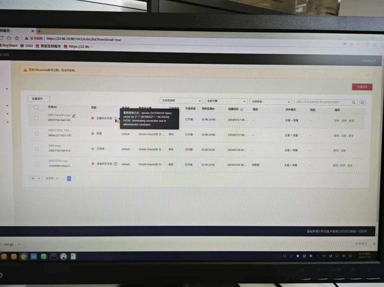 解决方法 1.修改日志库liblog中的周期性归档逻辑,不再fork子进程。 2.系统排查并整改GaussDB(for Redis)代码(包括使用的类库代码)中的fork调用。 3.最终排查结果,实际只有本次的这个问题点涉及fork。当前修改后即可确保GaussDB(for Redis)的时延保持稳定,不再受fork性能影响。 注:GaussDB(for Redis)由华为云基于存算分离架构自主开发,因此不存在原生Redis的fork调用的场景。 总结 本文通过分析GaussDB(for Redis)的一次由fork引发的时延抖动问题,探究了fork这个系统调用的性能影响。最新的GaussDB(for Redis)版本已解决了这个抖动问题,并清零了内部的fork使用,与原生Redis相比,彻底解决了fork的性能隐患。希望通过这个问题的分析,能够带给大家一些启发,方便大家更好的选型。 DRS (Database Replication System) 连接Oracle数据库出现网络连接异常的问题案例背景: 假设我们在使用DRS进行Oracle数据库迁移的过程中遇到了连接异常问题,具体错误为“connection reset by peer”。我们需要解决这个问题以便让数据迁移能够顺利进行。 案例描述: 环境:源Oracle数据库位于服务器A上,DRS服务器位于服务器B上。 现象:DRS服务器B在尝试连接服务器A上的Oracle数据库时出现了连接被重置的错误。 日志位置:DRS服务器的日志文件位于/opt/drs/logs/;DRS节点的日志文件位于/drs/run/job-id。 已知检查:使用了curl -kv 21.96.16.153:1521命令进行初步测试,返回了“connection reset by peer”的错误。 排查步骤: 1. SELinux配置检查 原因:SELinux可能会阻止某些网络连接。 操作: Bash # 查看SELinux状态 sestatus # 如果SELinux启用,尝试临时关闭它 sudo setenforce 0 验证:再次尝试使用DRS连接Oracle数据库,查看是否仍然出现同样的错误。 2. Firewall配置检查 原因:防火墙可能阻止了必要的端口访问。 操作: bash # 查看防火墙状态 sudo systemctl status firewalld # 如果防火墙启用,添加1521端口到允许列表 sudo firewall-cmd --permanent --add-port=1521/tcp sudo firewall-cmd --reload 验证:再次尝试使用DRS连接Oracle数据库,查看是否仍然出现同样的错误。 3. Oracle白名单配置检查 原因:Oracle的SQLNET.ORA文件可能限制了IP地址。 操作:登录到Oracle数据库服务器。 Bash # 查找SQLNET.ORA文件 find / -name sqlnet.ora # 允许所有IP地址 SQLNET.AUTHENTICATION_SERVICES=(NONE) # 或者指定DRS服务器的IP地址 SQLNET.ALLOWED_LOGON_VERSION_SERVER = 12 SQLNET.SSL_SERVER_DN_MATCH = YES SQLNET.ENCRYPT_SERVER = REQUIRED SQLNET.FEATURE_ENABLE = 1 SQLNET.ALLOWED_CLIENTS = 192.168.1.100 # DRS服务器的IP地址 综合验证: 再次尝试使用DRS连接Oracle数据库,查看问题是否得到解决 drs-FATAL terminating connection due to administrator command问题现象: 故障报错 drs版本:2.23.07.263 drs报错如下,应该是drs的meta库出现连接问题